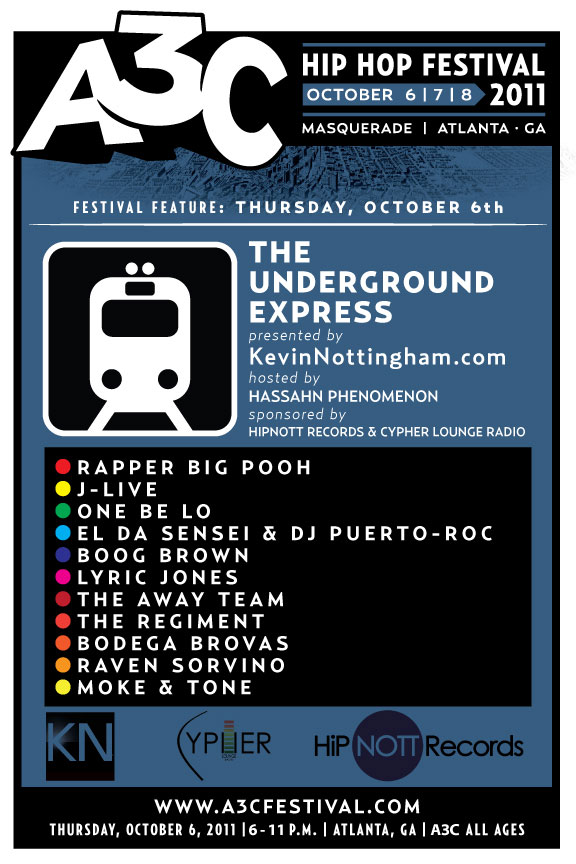 KevinNottingham.com, along with HiPNOTT Records and Cypher Lounge Radio, returns to the A3C Hip Hop Festival this October to present The Underground Express. Hosted by Cypher Lounge Radio’s Hassahn Phenomenon, this year’s showcase will feature performances from Rapper Big Pooh, J-Live, One Be Lo (of Binary Star), El Da Sensei with DJ Puerto-Roc, Khrysis & Sean Boog AKA The Away Team, Boog Brown, Bodega Brovas, The Regiment, Raven Sorvino, Lyric Jones and Moke & Tone. DJing the event will be HiPNOTT’s own DJ Mark-1.