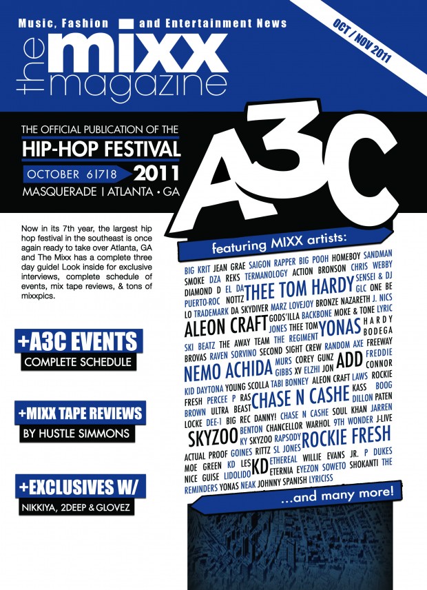 The Mixx Magazine's new issue is dedicated to the 2011 A3C Hip Hop Festival. The issue includes exclusive interviews with A3C performers Aleon Craft, Chase N Cashe, Yonas, Skyzoo, Thee Tom Hardy, KD, Rockie Fresh and A.Dd+. The publication serves as a guide for the 3-day event featuring a complete schedule and highlighting the showcases. There will also be a mixtape review section authored by DJBooth.NET's showcase host Hustle Simmons.