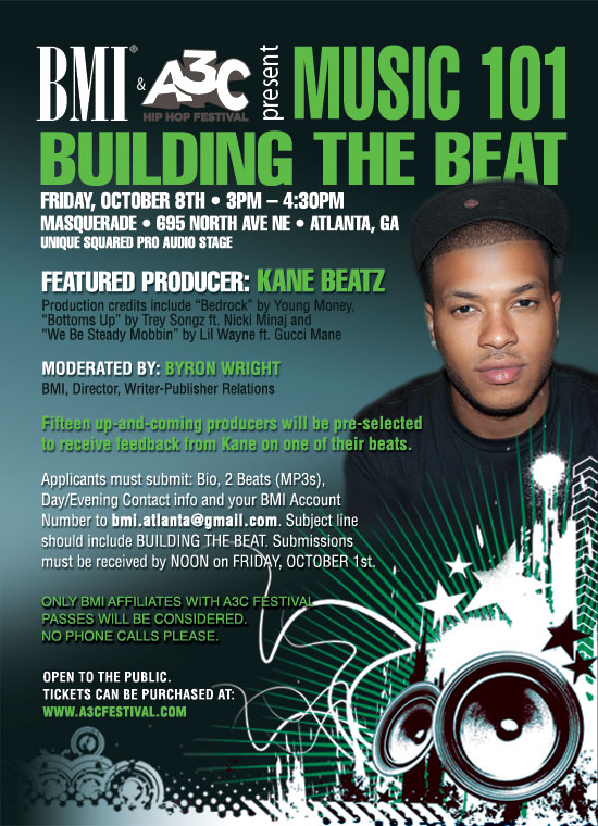 The Building the Beat workshop to take place on Friday, October 8th in conjunction with the A3C Hip Hop Festival will feature Kane Beatz, who was named a Top Producer at the 2010 BMI Urban Music Awards in Los Angeles and produced the following hit records: