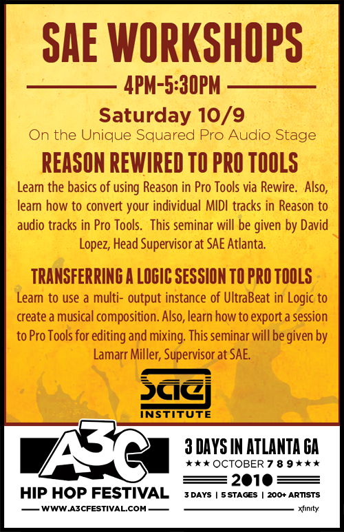 A3C is a place for musicians. This is why we are happy to announce two great classes being offer by SAE during the A3C: "Reason Rewired to Pro Tools" and "Transferring a Logic Session to Pro Tools." The classes will be offered on Saturday at 4:00pm on the Unique Squared Pro Audio Stage.