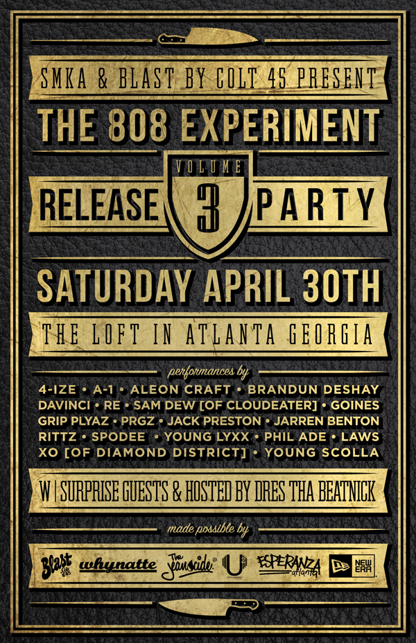 SMKA & Blast by Colt 45 present the Release Party for The 808 Experiment: Vol 3. The Event is at the loft on April 30th. Now in its third year, this event is sure to be a great show with live energy.