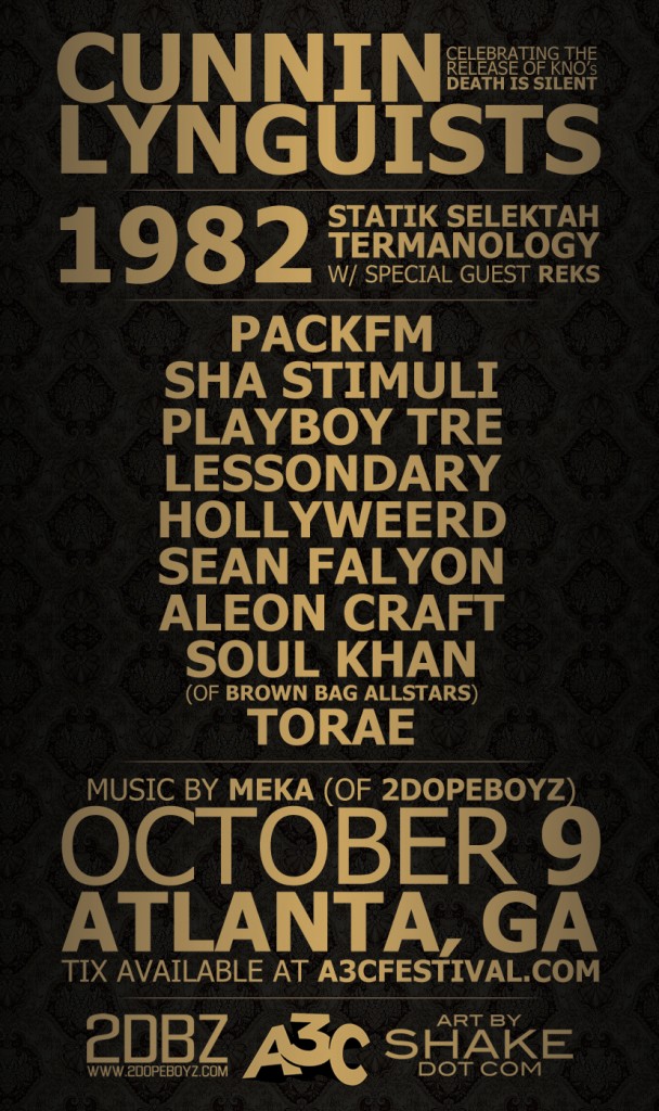 On October 9th, your favorite dopeboyz on the internet will be hosting their own showcase at The Masquerade at this year’s A3C Festival in Atlanta. As the flyer above shows, CunninLynguists will be headlining the event (celebrating the release of Kno’s debut album, Death Is Silent). Fellow QN5′r PackFM will join in on the celebration as well. On top of that, Statik Selektah and Termanology (w/ the help of Reks) will also be celebrating the release of their collaborative 1982 album. We’re also gonna be rounding out the show with (2)dope mainstays Sha Stimuli, Torae, Playboy Tre, The Lessondary, Hollyweerd, El Prez, Shawyn Chrystopher, Sean Falyon, Aleon Craft and Soul Khan (of Brown Bag AllStars). - 2dopeboyz