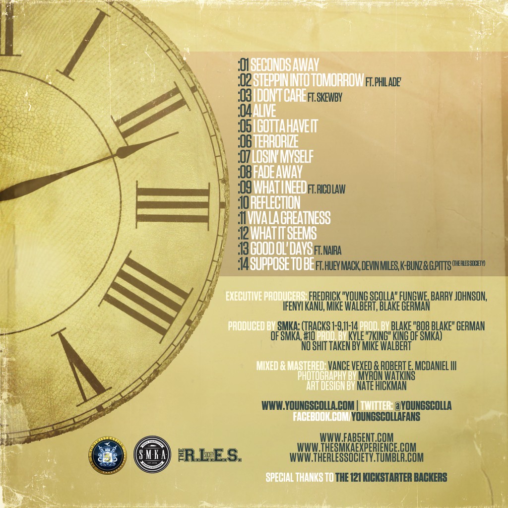 On March 12, 2011 Young Scolla, SMKA & Fab 5 Ent completed their Kick Starter campaign and began working on a collaborative album in Atlanta, GA. Through Kick Starter they raised over $4,500 by 121 backers, which has been invested into the production of the album, now titled, “Seconds Away.”