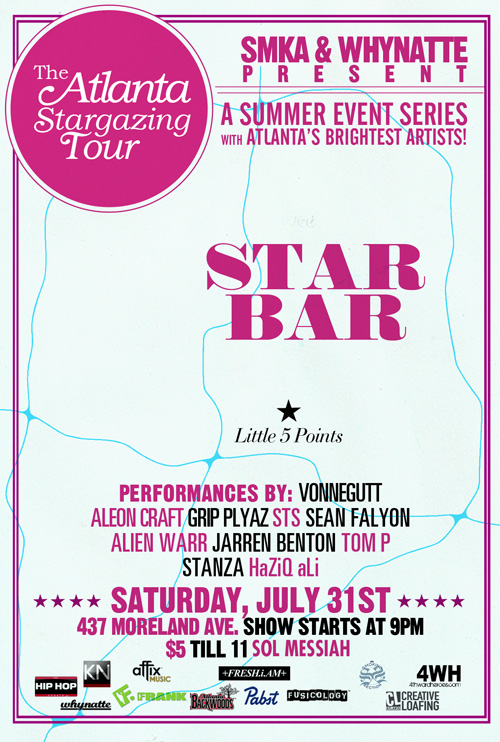 The 3rd stop of the Atlanta Stargazing Tour is only 2 days away! SMKA continues to bring together some of the best local artists- this time with amost exclusively hip-hop acts- for only $5. With performances by Vonnegut, Stanza, Aleon Craft and Grip Plyaz you won't want to miss this one! Also performing are Sean Falyon, STS, Haziq Ali, Tom P, Alien Warr and Jarren Benton. In case you're not great at math, that's 10 SMKA approved artists for only 5 bucks.