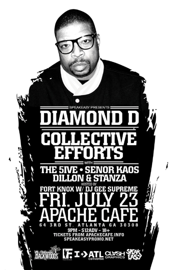 This is pretty much an A3C alumni show: Diamond D, Collective Efforts, Dillon, Stanza, Senor Kaos. We're going to give away two pairs of tickets. To win, leave a comment naming at least one song by every artist playing this show (Artist Name - Song).