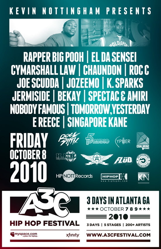 KN.com will be representing in full effect at the A3C Hip Hop Festival in Atlanta, GA this year with a showcase on the 8th (Friday night) from 8-10pm at the outside stage. As you can see from the flyer above, the showcase will feature HiPNOTT Records recording artists and they have also teamed up with Coalmine Records and the Hall of Justus Music Group to bring together headliner acts such as Rapper Big Pooh, El Da Sensei, and Chaundon.