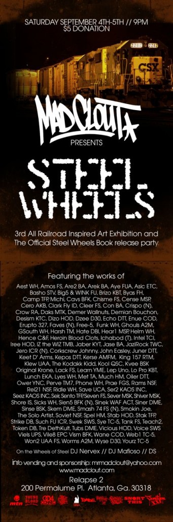 On Saturday Sept. 4th-5th, Mad Clout presents 'Steel Wheels'. An all railroad inspired art exhibition and official 'Steel Wheels' book release party. DJ Nervex, DJ Mafioso, DS, and DJ Lord of Public Enemy provide the music for the evening.