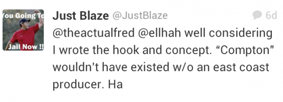 Shortly after Kendrick’s album dropped, I tweeted about how Kendrick’s “Compton” isn’t how a West Coast track with that title should sound, and that I found it puzzling that a West coast producer wasn’t used on it. I mean, the word Compton represents more than a place. It represents an attitude and a way of life. Just Blaze, who did produce the track, tweeted this back: